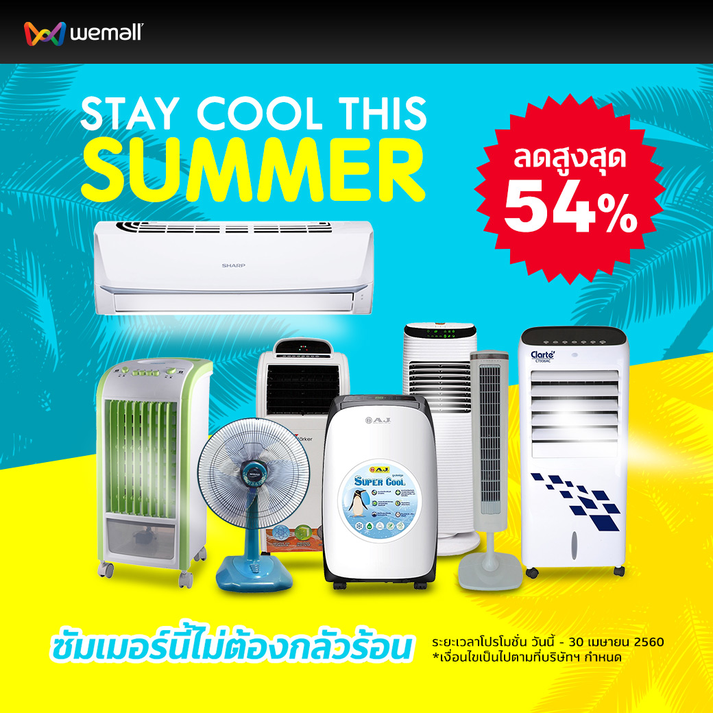 เว็บช้อปปิ้งออนไลน์ Wemall เชิญคุณมาดับร้อน เติมความเย็นกันให้สบาย กับการยกขบวนสินค้าเครื่องใช้ไฟฟ้าภายในบ้านมาลดกันสูงสุดถึง 54% คุณจะพบกับสินค้าแบรนด์คุณภาพ อาทิ Toshiba, Sonar, Clarte’, Accord ที่พร้อมจะช่วยดับร้อนในซัมเมอร์นี้ ระยะเวลาโปรโมชั่น ตั้งแต่วันนี้ – 30 เมษายน 2560 *เงื่อนไขเป็นไปตามที่บริษัทกำหนด
