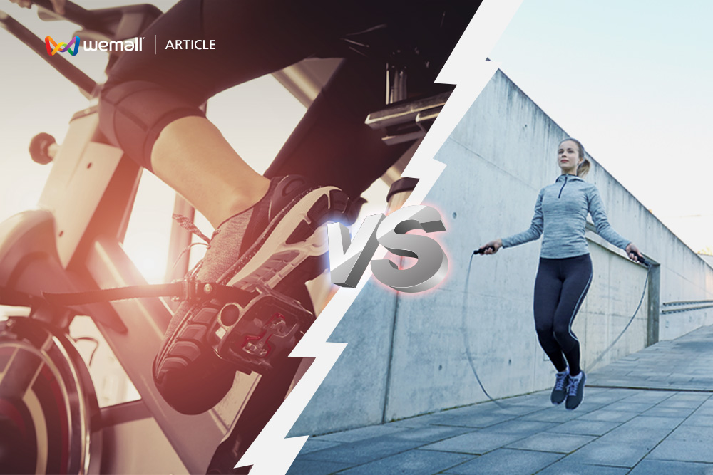 หลายๆ คนอาจรู้ประโยชน์ของการออกกำลังกายด้วยการกระโดดเชือก และปั่นจักรยานมาประมาณหนึ่งแล้ว แต่เชื่อเถอะว่า สำหรับนักออกกำลังกายมือใหม่ ที่อยากลดน้ำหนัก ต้องเคยสงสัยบ้างละ ว่าการกระโดดเชือก กับการปั่นจักรยาน อันไหนจะเป็นวิธีที่มีประสิทธิภาพสูงที่สุดมากกว่ากัน วันนี้ WeMall จะมาช่วยให้ผู้อ่านตัดสินใจได้ง่ายขึ้นครับ